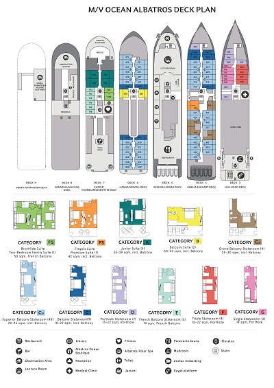 Camp de base moderne pour l’exploration polaire, l’Ocean Albatros propose deux restaurants, un lounge panoramique, un bar nordique, un spa, un sauna avec vue sur l’océan, une salle de sport, une bibliothèque ainsi que plusieurs ponts extérieurs et salons d’observation pour profiter pleinement des paysages.