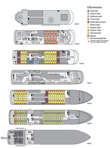 Les 102 cabines de l’Ultramarine sont réparties en 9 catégories de suites, avec des configurations en solo, double, triple et quadruple.Elles disposent toutes d'ouvertures sur l'extérieur, et la plupart possèdent même un balcon.Les cabines doubles sont particulièrement spacieuses, offrant entre 26.5 m2 et 56 m2 de superficie.Plus de détails ICI.